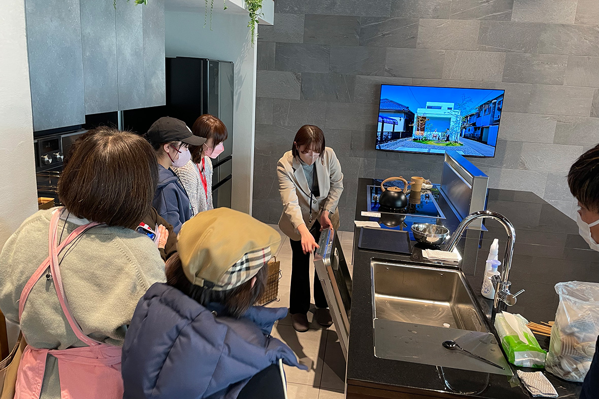 咲くらすモデルルームのキッチンは、ドイツ・ガゲナウ社製の最新設備機器を使っている御影石の天板が美しいオーダーメイド(造作)のアイランドキッチンです。